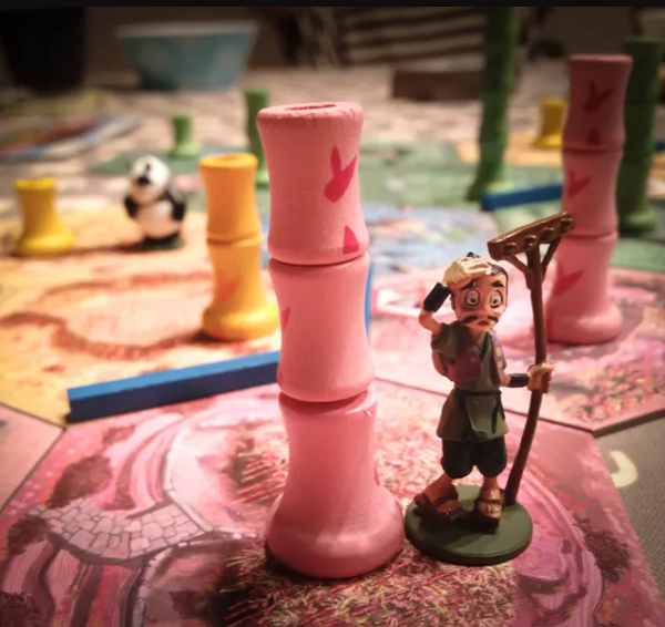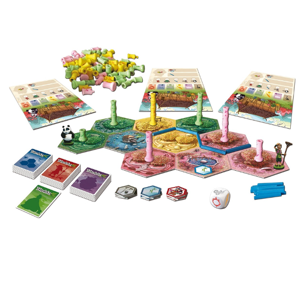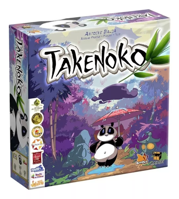 En Takenoko , los jugadores cultivarán parcelas de tierra, las regarán y harán crecer una de las tres especies de bambú (verde, amarillo y rosa) con la ayuda del jardinero imperial para mantener este jardín de bambú. Tendrán que soportar el hambre desmesurada de este animal sagrado por el jugoso y tierno bambú. El jugador que administre mejor sus parcelas de tierra, cultivando la mayor cantidad de bambú mientras satisface el delicado apetito del panda, ganará la partida.